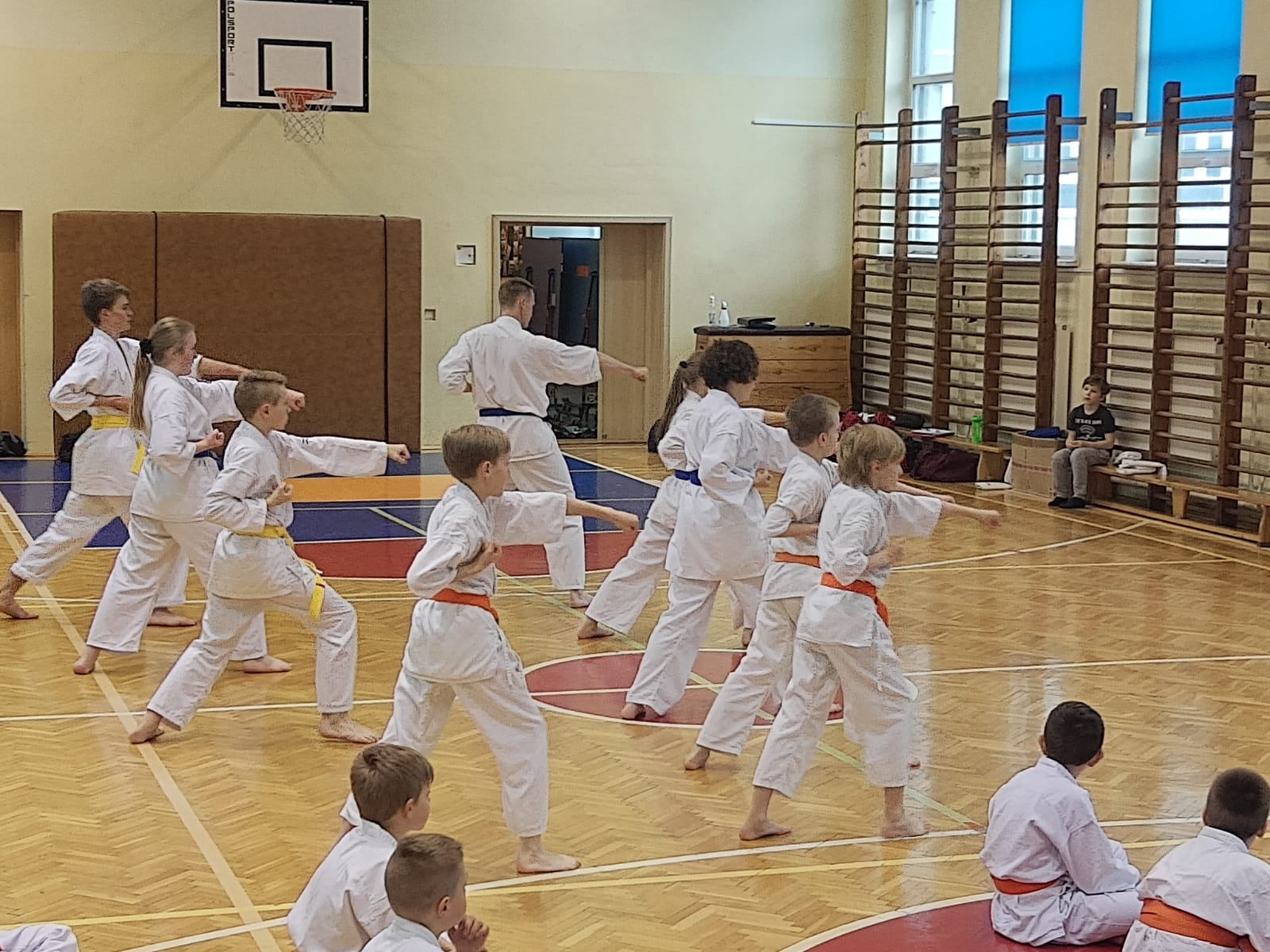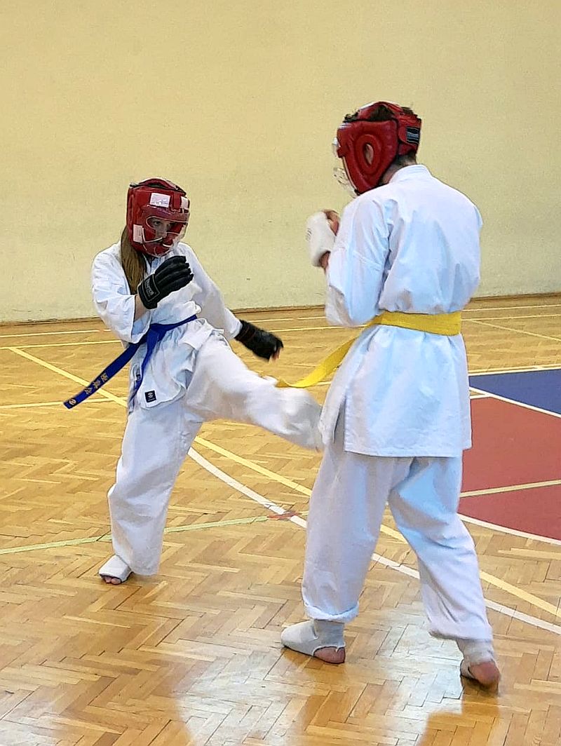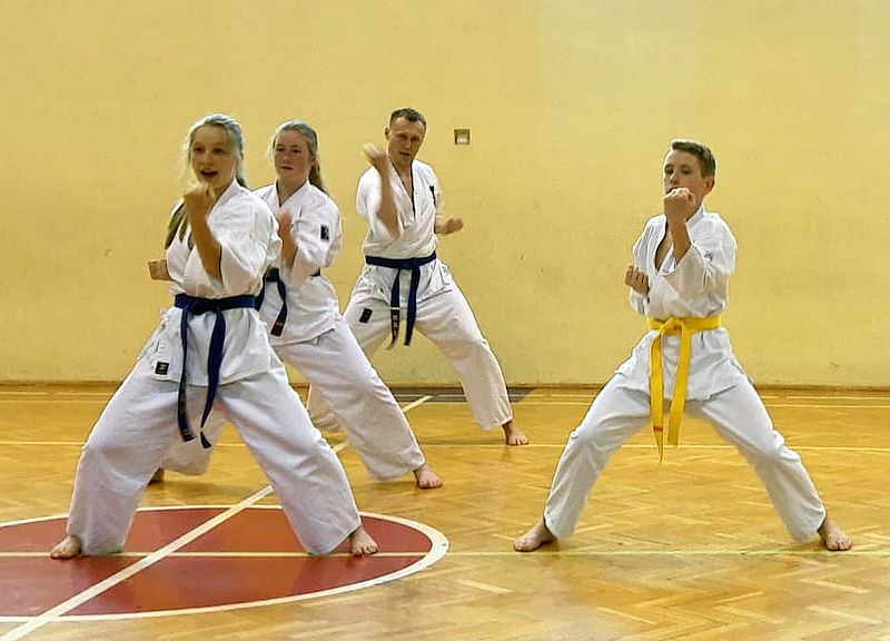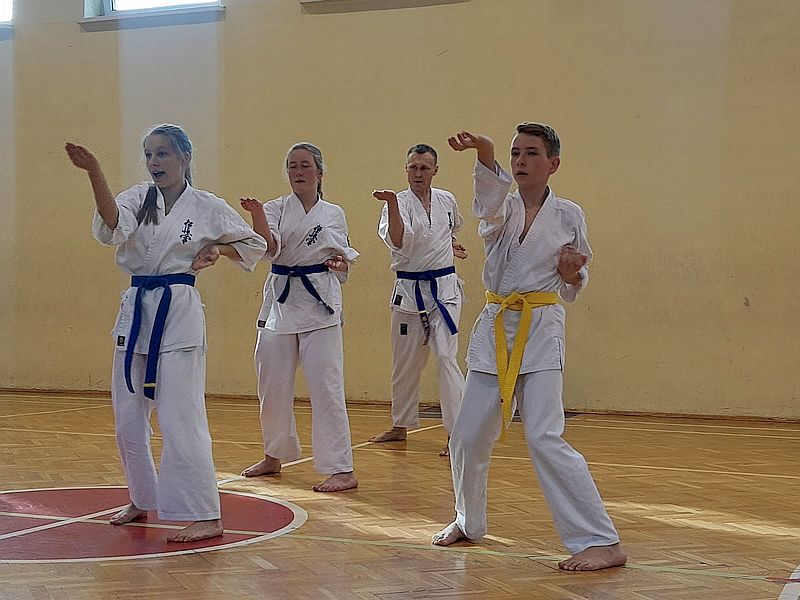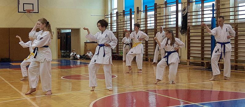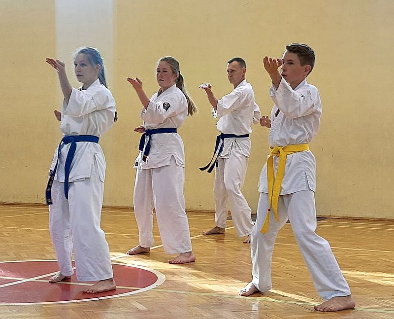 Zdający na niebieskie i żółte pasy prezentowali dodatkowo kata i umiejętności walki.