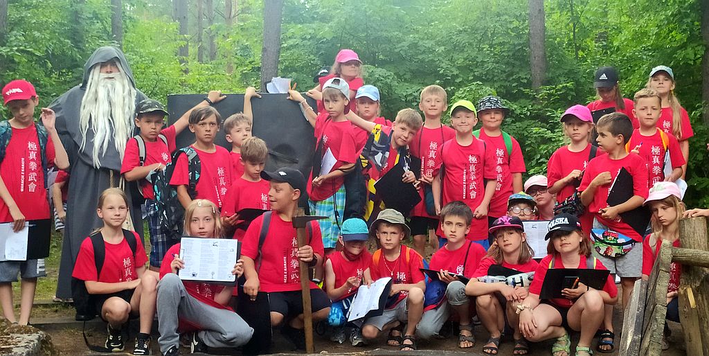 W tym roku ponownie odwiedziliśmy Wioskę Górniczą w miejscowości Piła-Młyn. Miejsce przez ten czas wzbogaciło się o nowe obiekty i atrakcje. Nasi podopieczni ruszyli w trasę poszukując ukrytego skarbu a przy okazji poznając przyrodę i historię tego ciekawego miejsca. Nie mogło również zabraknąć treningu mocno-nocnego o północy. Niektórym trudno było wstać i podejmować zadania, ale wszyscy dzielnie wytrwali zaliczając cały trening min. wykonując 1000 technik!