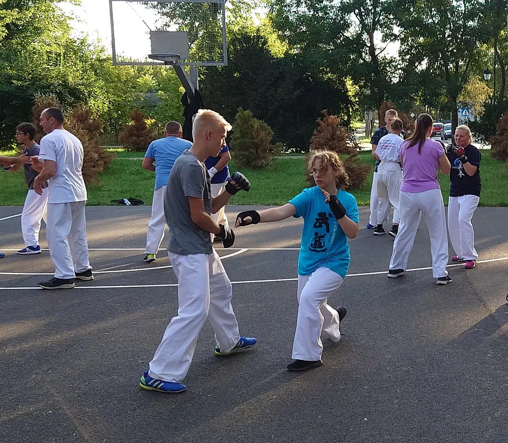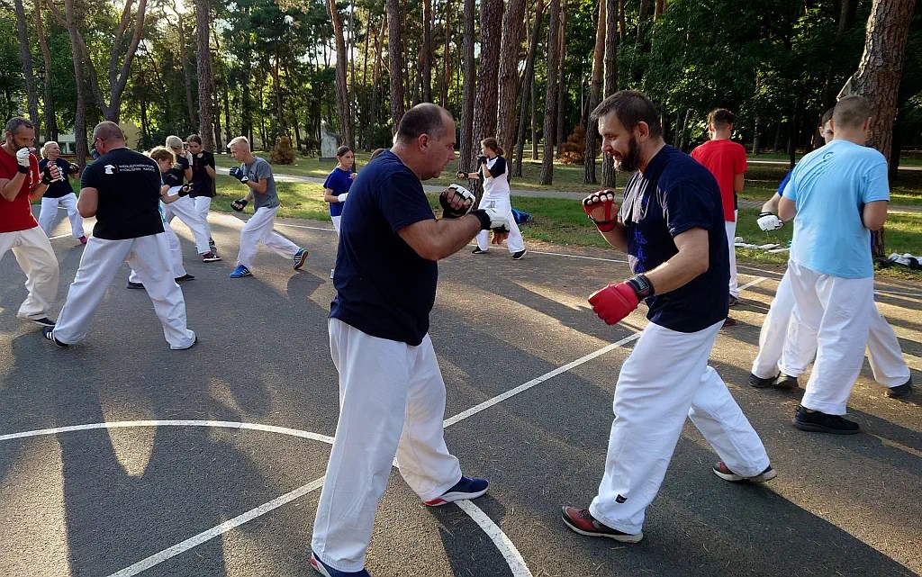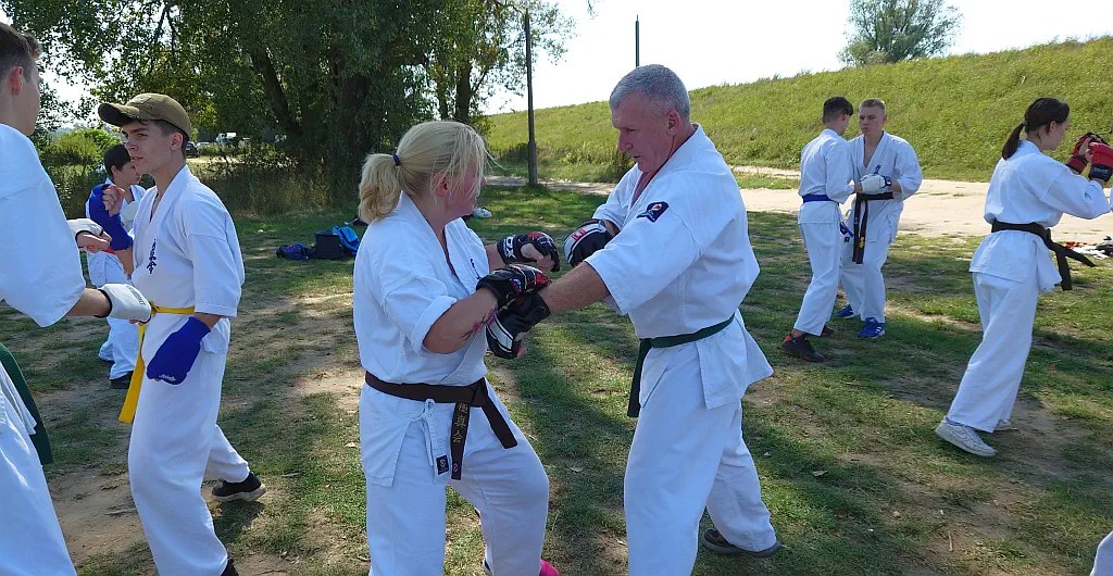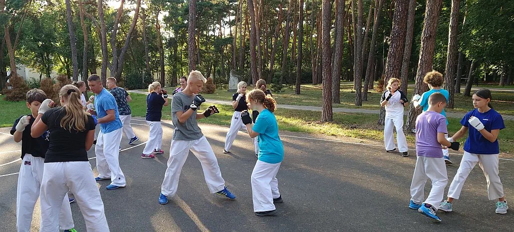 Niedzielny rozruch w Parku Sosnowym rozbudził nas skutecznie. Po śniadaniu na ostatni trening poszliśmy nad Wisłę. Tematem było obrona przed atakiem przeciwnika poprzez zmianę pozycji lub zastosowanie bloku.