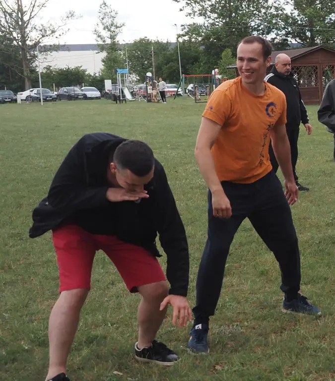 Piknik piknikiem, a trening trzeba zrobić 😉 Tak też się zaczęło – krótka rozgrzewka i trening w pigułce – rozgrzewka, kiho-geiko, wspólne kata, ćwiczenia samoobrony i sparing. Rodzice nie dali się namówić na wspólne ćwiczenia, ale będziemy jeszcze w przyszłości próbować 🙂
