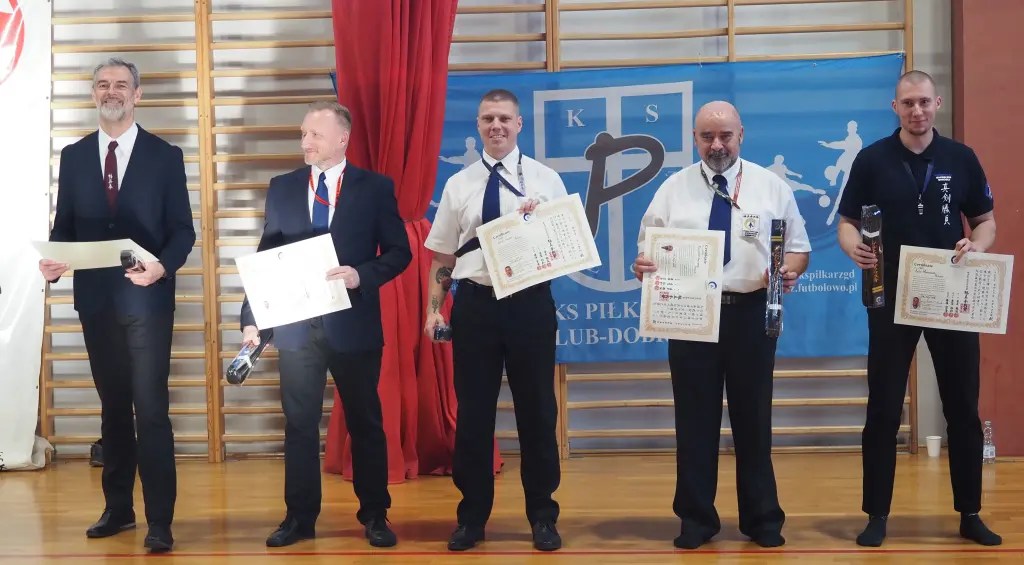 W przerwie zawodów shihan Bogusław Jeremicz 7 dan wręczył certyfikaty i czarne pasy na stopnie mistrzowskie. Między innymi pas i certyfikat otrzymał Artur Wilento 6 dan oraz Krzysztof Komorowski 2 dan – gratulacje!! 👏😃